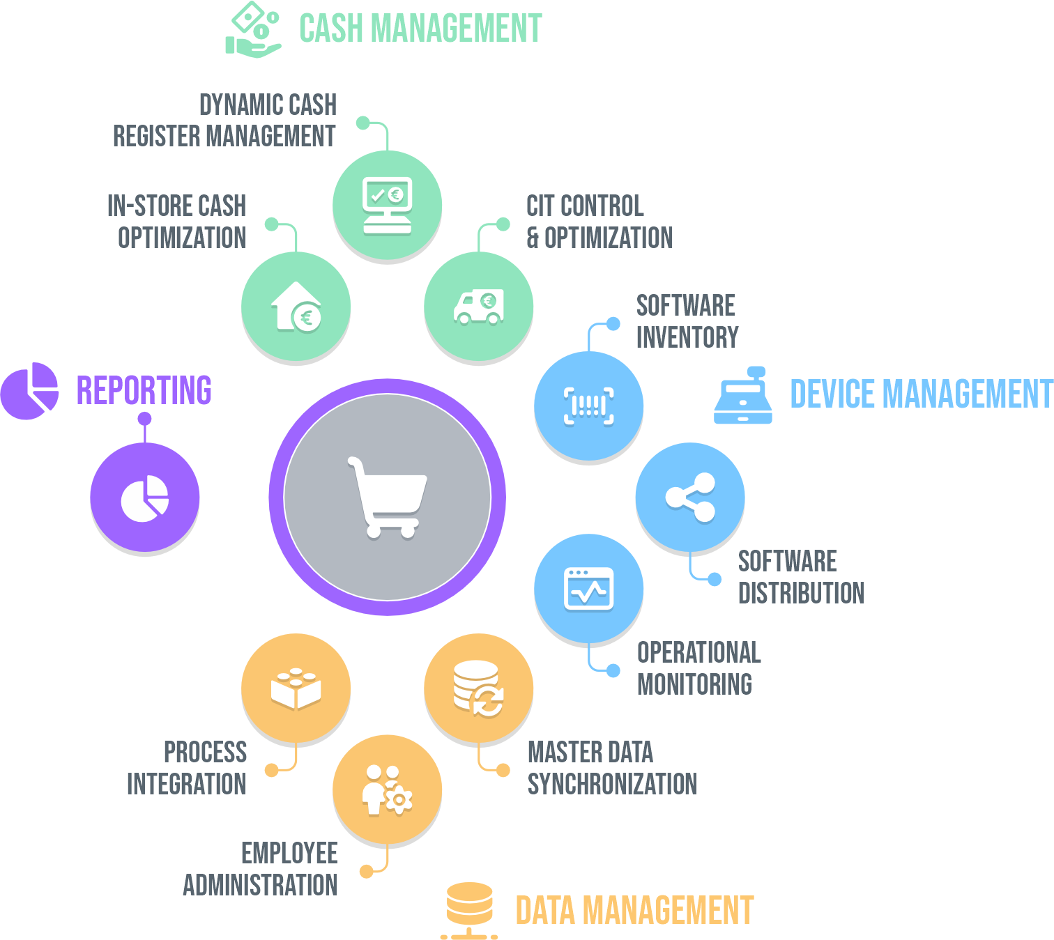 Die Software-Lösung hilft dabei, Prozesse vom Cash Management über das Device Management bis hin zum Data Management zu vereinfachen. Zudem zeigt das umfassende Reporting Optimierungspotenzial auf.
